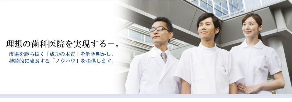 経営者である院長先生は、理想の医院運営を実現することができるように、体力の残っているうちに強い歯科医院へと変革しなければなりません。私たちは、これからの時代を勝ち続ける強い歯科医院になる為のサポートを、総合的に、あるいは課題別で提供いたします。