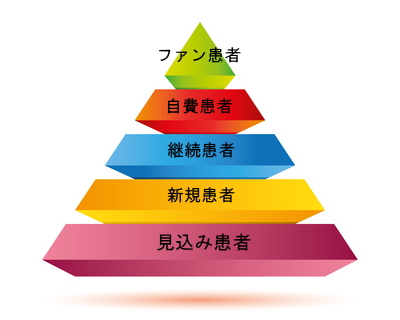 見込み患者とは、医院の存在を知っているが来院したことがない人。見込み患者が増えないと、新規患者は増えない。新規患者が増えないと、ファン患者も増えない。つまり、見込み患者を増やすことが第一条件です。